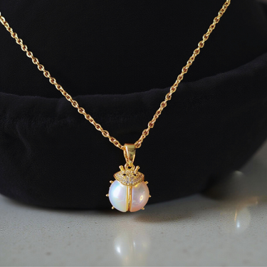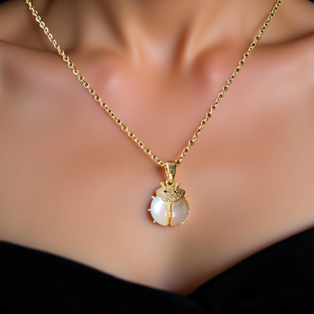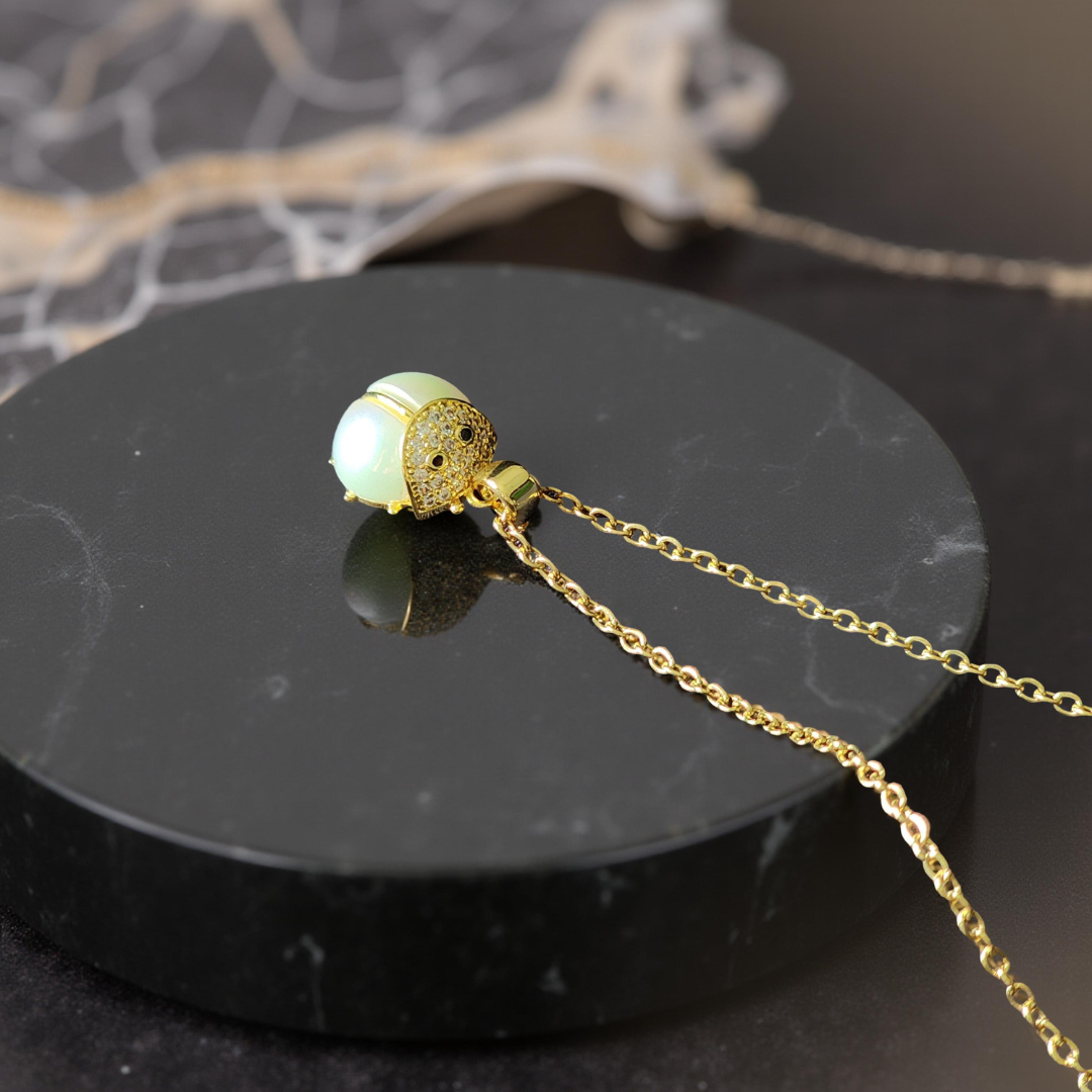 A playful yet elegant charm, this pendant features a luminous orb cradled in a delicate gold-plated casing shaped like a ladybug. Adorned with tiny sparkling stones, it blends whimsy with sophistication.Lightweight and versatile, it’s a conversation starter that brings a touch of nature-inspired grace to your style.