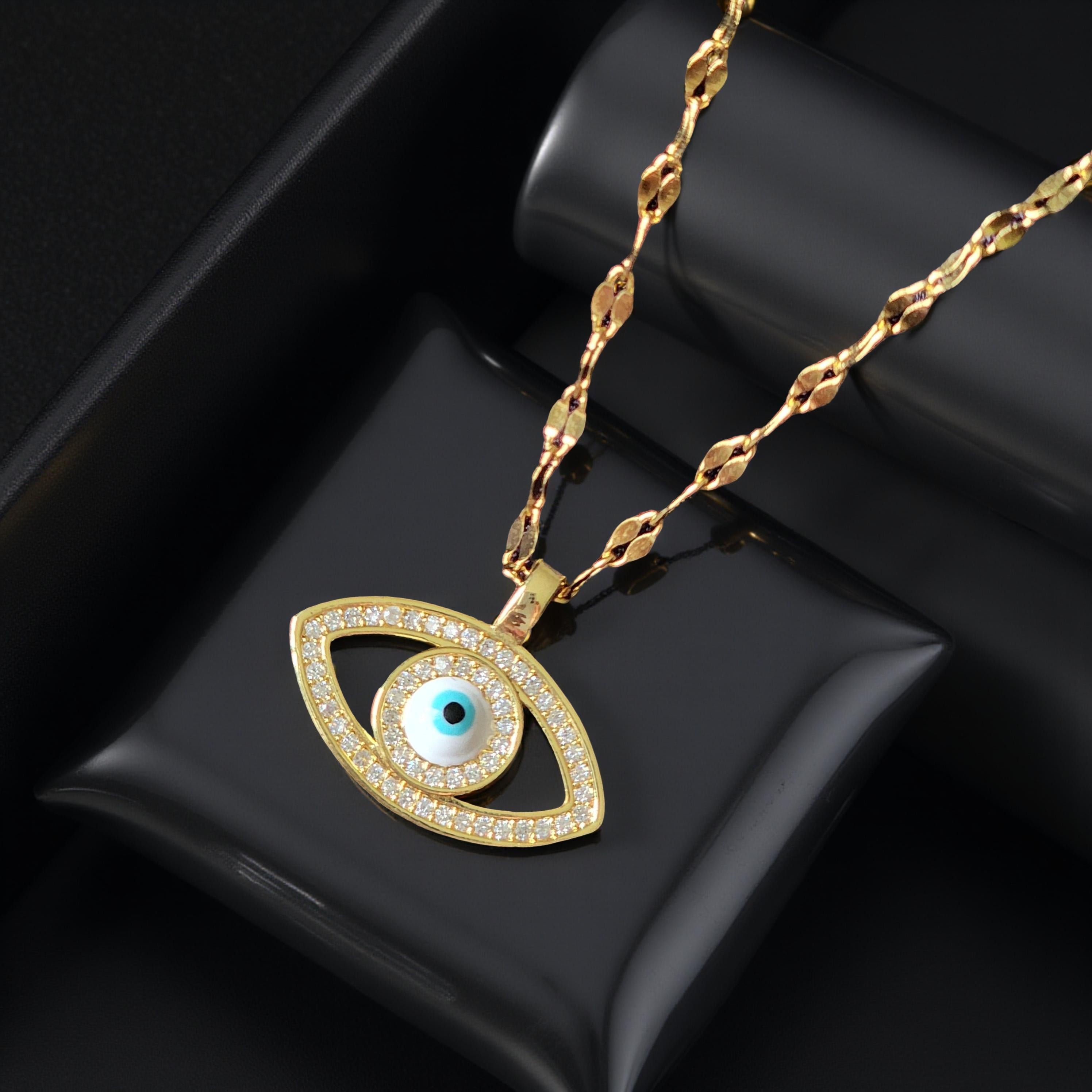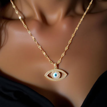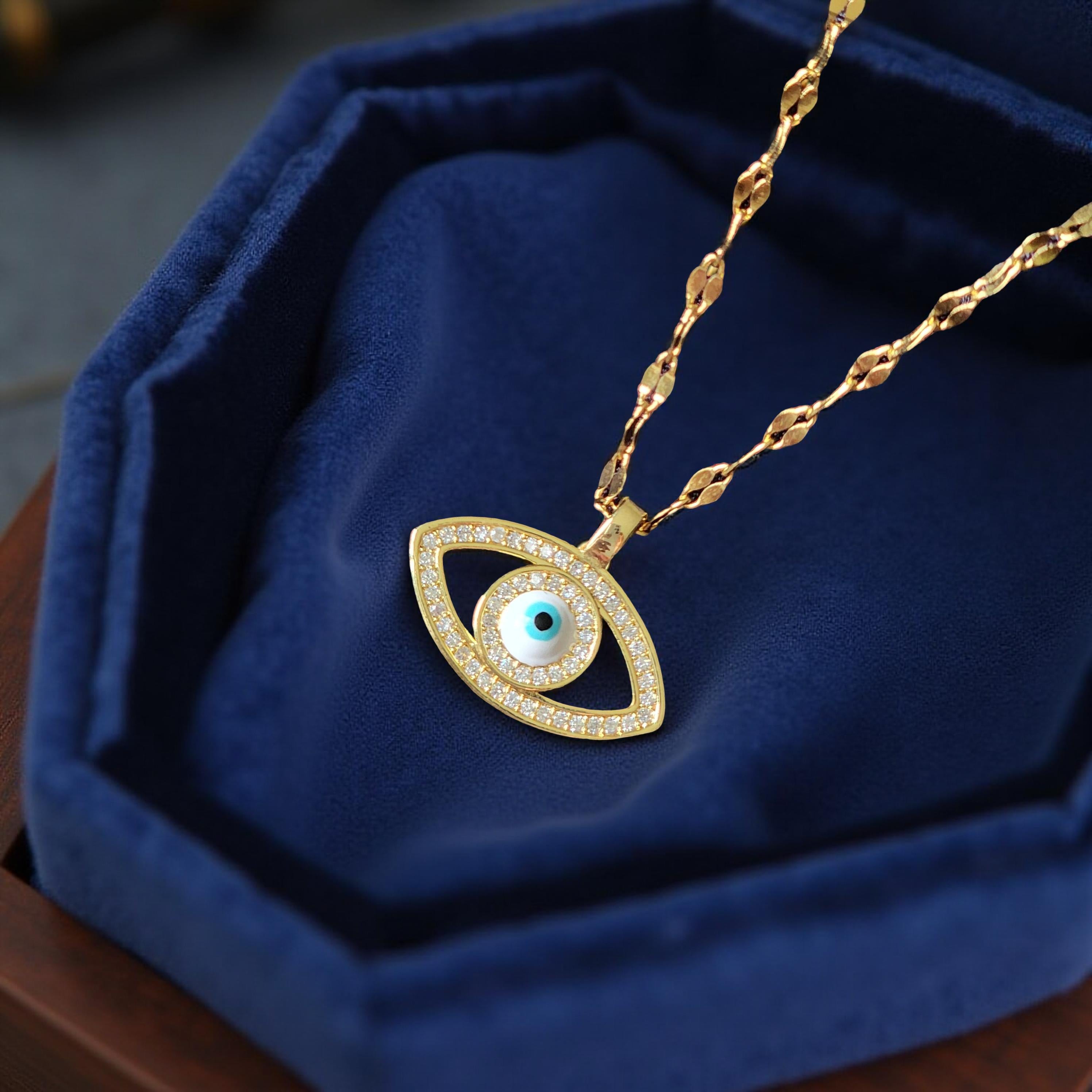A striking evil-eye pendant crafted in radiant gold, framed with shimmering cubic zirconia stones for a touch of sparkle. At its center lies the iconic blue eye, symbolizing protection, positivity, and good fortune. Suspended from a textured gold chain, this pendant blends timeless tradition with modern elegance.