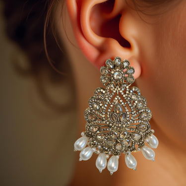 Exuding timeless elegance, these earrings are a true tribute to Indian heritage jewellery. Designed with intricate jadau-style craftsmanship, the piece features a floral-inspired motif, delicately encrusted with uncut stones that shimmer with regal brilliance. Dangling clusters of luminous pearls add a touch of divine grace, reminiscent of temple adornments and royal heirlooms.