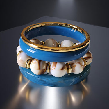 A refined symphony of elegance, this stack blends the soft allure of blush-toned bangles with the timeless charm of marbled beads, accented by gleaming gold details. Designed to exude understated opulence, it effortlessly elevates both daywear and evening ensembles, making it a versatile yet statement-worthy adornment.